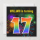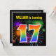Este divertido y vibrante diseño de invitaciones para fiestas de cumpleaños presenta un colorido patrón inspirado en los estallidos de fuegos artificiales de celebración, junto con el número "17" que presenta un multicolor arcoiris como espectro o gradiente. El nombre en la parte delantera se puede personalizar. En la parte posterior se incluyen detalles personalizados sobre el fiesta. Las invitaciones a fiestas de cumpleaños como esta podrían ser usadas para invitar a los invitados a una fiesta de cumpleaños que se lleva a cabo para celebrar el decimoséptimo cumpleaños de alguien. [~Z0000337]