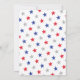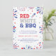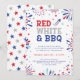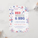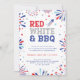 Celebre el cumpleaños de América con esta invitación a la fiesta del 4 de julio con la frase "ROJO, BLANCO Y BBQ" y decorada con un pequeño cohete, fuegos artificiales patrióticos y pequeñas estrellas.