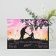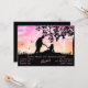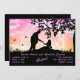 Silueta romántica de una pareja bajo un árbol con luna llena al fondo y algunas mariposas. El fondo es un cielo estrellado, nublado rosa y naranja. Ideal para un anuncio de fuga o fiesta de compromiso.
