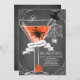 Fun halloween cocktail Party Invitation con un vaso de martini adornado con una araña negra, telarañas, gorra de brujas, calabaza de linterna jack o lantern sobre un fondo contemporáneo de pizarra negra
