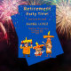 A fun Fiesta Retirement Party Invitation to celebrate someone special on their Retirement, designed with Mariachi band caricatures playing their instruments, dressed in vibrant orange and yellow on a blue background. The front text includes: Retirement Party Time!, Join Us As We Honor, The First and Last Name, The Date and Time, The Location and Address. The reverse text includes: Reply and your Contact Details. To personalize, simply insert your event details into our easy template, replacing the sample text. This invitation is available in both Print and Download.