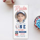 ¡Celebra el gran día de tu pequeño slugger con esta divertida invitación al primer cumpleaños dedicada al béisbol! Diseñado como un boleto deportivo y con un espacio para la foto de su hijo, este juguetón diseño "Rookie of the Year" es perfecto para una fiesta deportiva de primer cumpleaños. Con audaces acentos rojos y marinos y un ambiente clásico de béisbol, es una manera memorable de invitar a amigos y familiares a que aclamen a su estrella de volverse.
