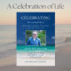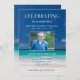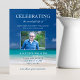 Invitación a la conmemoración de los funerales que incluye un fondo de playa en el océano, una foto de la persona, y una plantilla de celebración azul de la vida que es fácil de personalizar.