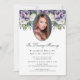 Elegante servicio de fotos de flores moradas/celebración de la vida/funeral/en una encantadora invitación a la memoria que incluye una foto con flores moradas y blancas y vegetación.