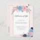 Un diseño floral elegante con rosas en tonos de rosa, azul marino y azul polvoriento, sobre un fondo sonrosado.
