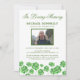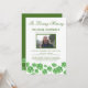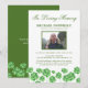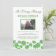Invitación de recuerdo funerario que presenta un fondo blanco tradicional, tréboles de acuarela verde, una foto de la persona y una plantilla de celebración de la vida fácil de personalizar.