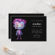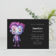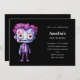 Invitación de cumpleaños con un lindo ilustracion. Monstruo Frankenstein con pelo rosado y púrpura y traje y corbata de dapper.