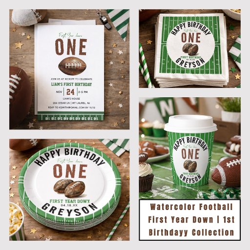 Celebra el gran día de tu pequeño vicepresidente con esta invitación de primer cumpleaños de Watercolor Football "First Year Down". Con encantadoras obras de arte de fútbol acuático y detalles deportivos, es perfecto para su futuro bash de cumpleaños de toda la estrella. Personaliza con detalles de fiesta y prepárate para una celebración de touchdown!