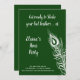 Una gran pluma de pavo real decora esta invitación de fiesta de gallinas sobre un fondo verde esmeralda con el dicho lindo, ¡Prepárate para sacudir tus plumas! haciéndolo perfecto para una noche en la ciudad bailando para celebrar a la novia.