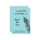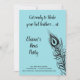 Una gran pluma de pavo real adorna esta invitación a la fiesta de gallinas sobre un fondo turquesa, azul con el dicho lindo, ¡Prepárate para agitar tus plumas! haciéndolo perfecto para una noche en la ciudad bailando para celebrar a la novia.