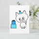 Una imagen agradable del dibujo animado de un pequeño gato blanco en un gorra azul del cumpleaños que se sienta al lado de algunos regalos de cumpleaños.