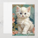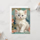Tarjeta con un gato blanco en el estilo de Alphonse Mucha. Este gatito esponjoso de ojos azules posa con flores rosadas y mantas azules. Un regalo fabuloso para amantes de los gatos y coleccionistas de Art Nouveau!