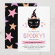 Esta invitación de fiesta de Halloween súper linda presenta un gato negro dibujado a mano, que lleva un sombrero de bruja y una corbata de lazo. Además de negro, otros colores incluyen pastel violeta, rosa y melocotón. El texto dice, "¡Es hora de ponerse ESPELUZNANTE!" en una fuente moderna y multicolor. La parte trasera de la tarjeta contiene estrellas rosas, violetas y melocotón sobre un fondo negro.