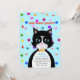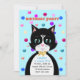Tarjeta de invitación a fiesta de cumpleaños con un lindo gato de esmoquin como mensajero y puntos multicolores sobre fondo turquesa claro. Todo el texto listo para ser personalizado.