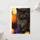 Tarjeta con un gatito de Halloween vintage! Un gatito negro esponjoso posa junto a calabazas contra un fondo púrpura. Un regalo divertido para fiestas de Halloween y amantes de los gatos!