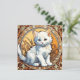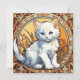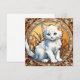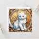 Tarjeta con un gato al estilo de Alphonse Mucha. Este gatito blanco esponjoso mira adorablemente al espectador. Las flores decoran la escena. Un regalo perfecto para los amantes de los gatos y coleccionistas de Art Nouveau!