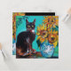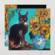 Expresivo , caprichoso gato negro , girasoles coloridos y hojas verdes en colores amarillo y azul turquesa. Pintura de acrílico original artística y vibrante en el panel de madera de Bulgan Lumini (c)