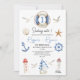 Invitación a un primer cumpleaños con tema náutico totalmente editable para los mellizos con una boya salvavidas con el número de edad en el interior, casas de luz, velero, gaviotas, casco de barco y más con un fondo blanco. Esta invitación de cumpleaños para niños con temática náutica puede ser utilizada para cualquier edad y es ideal para alguien que busca una simple invitación moderna para gemelos.