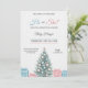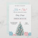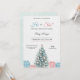 "Gender reveal invitation with a festive theme. It features a decorated Christmas tree, blue and pink gifts, and elegant text on a marble background."