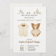 Gender reveal party invitation card featuring pastel outfits: a beige romper and brown overalls. Elegant, warm tone, with event details beneath.