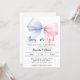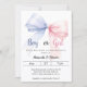 White background, decorated with a large blue and pink bow. For a gender reveal. Personalize and add names and party details.