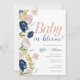 Una invitación floral Baby in Bloom con flores rosadas y navales para el género revela la temática ducha de bebé. Esta invitación es perfecta para ser neutra en cuanto a género o para revelar duchas para bebés.