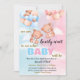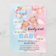¡Podemos esperar a ver qué será el bebé" Invitación a revelar género Prepárense para celebrar la gran revelación con esta adorable invitación a revelar personalizable! Con un encantador diseño de acuarela de fondo medio rosa y medio azul, y dos osos dulces sosteniendo un montón de globos rosa y azul, esta invitación es la manera perfecta de compartir las emocionantes noticias.