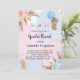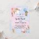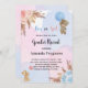 Para una moderna ducha de bebé estilo boho, el sexo revela fiesta. Un fondo azul, rosa, blanco y acuático. Decorados con oro rosa, flores rosadas y azul claro, rosas, pampas y dos osos de peluche con globos. Personalice y agregue un nombre y detalles del fiesta.