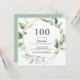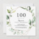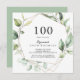 Esta geométrica y elegante invitación a la fiesta de cumpleaños 100 es perfecta para una fiesta de cumpleaños moderna. El diseño se basa en hojas de eucalipto botánico pintadas a mano, adornando un marco geométrico dorado.