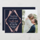 Elegante, moda y moderno con una apariencia retro, traza falsa rosa impresa en forma de diamante geométrico dorado sobre el polvoriento corte de diamante azul, malva y rosa rubor, tarjeta de boda Save-the-Date. Este diseño clásico y sofisticado es perfecto para una pareja casera moderna y elegante. Personalice con su propio mensaje en la parte delantera, así como un monograma inicial personalizado en la parte posterior. Todo el diseño de impresión fotográfica.