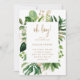 Moderna invitación botánica a la ducha de bebé con el título "¡oh chico!" y sus detalles dentro de un marco geométrico rodeado de vegetación tropical de acuarela y falsas hojas de oro. El reverso es un tono dorado a juego. Una elegante invitación perfecta para una celebración de verano.