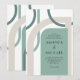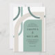 Una versión moderna de un glamuroso ambiente art déco de días pasados, esta colorida invitación de boda tiene formas geométricas curvas entrelazadas alrededor del diseño del texto de la invitación. Los colores incluyen la popular paleta de colores del verde mar y el beige marfil neutro que enmarca su texto. Los resultados son únicos y artísticos con un atractivo retro. Esta paleta de colores es una excelente opción para bodas en la costa, en la playa o en un destino.