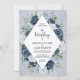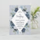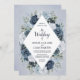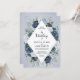 Una invitación clásica y elegante, con detalles bodas en el interior de un diamante blanco rodeado de flores exuberantes en tonos azules, marinos y blancos, todo ello sobre un cálido fondo de color azul polvoriento. La tarjeta se transforma en una pequeña disposición floral en el centro. Esta invitación forma parte de una hermosa suite boda que puede ser totalmente personalizada.