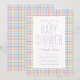 Celebremos a un bebé en el camino con esta dulce invitación a la ducha de bebé de arcoiris pastel. El colorido marco inspirado en gingham marca la pauta para una celebración divertida. El sencillo y dulce texto púrpura se puede personalizar con todos los detalles de tu ducha de bebé. También se dispone de suministros de fiesta de coordinación. También disponible como una invitación digital a la ducha de bebé.