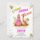 Una divertida y adorable invitación para una fiesta de cumpleaños para chicas con un tema de dinosaurios, con un ilustracion acuarela de un adorable dinosaurio usando un gorra fiesta, parado al lado de una torta gigante de cumpleaños casi tan alta como ella. Celebra tu pequeño y salvaje con este estómago, chompa e invitación ruidosa que marcará el tono para un tiempo realmente salvaje.