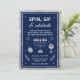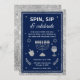 Alza un vaso y haz girar la dreidel con esta elegante invitación de Hanukkah "Gira, Bebe y Celebra". Con un fondo azul marino profundo con acentos de brillo plateado falso brillante, este diseño combina la tradición con un toque moderno. Una menorá brillante ancla el diseño, rodeada de iconos festivos que incluyen una dreidel, una copa de vino, Estrellas de David y florituras de celebración. Perfecta para reuniones de adultos o eventos comunitarios animados, esta invitación marca el tono para una noche de alegría, juegos y compañía radiante.
