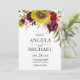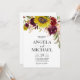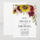 Diseño de invitación de boda de girasol borgoña rosa desmayado peonía rosa cuenta con una hermosa media corona de elementos florales de girasol de acuarela, peonías y rosa en varios tonos de rosa desmayado, rojo borgoña, Marsala/ciruela y más sobre vegetación pintada.
