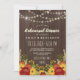 Ensayos rústicos invitan a cenar con texto amarillo pálido sobre un fondo de grano de madera impreso, decorado con arreglos de girasoles y rosas rojas profundas, trigo, bayas y hojas verdes, y filas de brillantes luces de cuerda. La cena de ensayo está escrita en un adorable guión de caligrafía, amarillo chillón. La parte trasera tiene un patrón de gingham amarillo cálido.