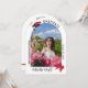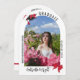 Curada invitación a la fiesta de graduación en forma de arco con arcos y detalles de cinta rojas, fuentes negras rojas y mate, y la foto de su hija. Invitación a una fiesta de graduación y invitación de graduación en una, personalizada con la foto en forma de arco del graduado en la portada y la invitación a la fiesta en la parte de atrás con adorables detalles del arco en rojo, el gorro de graduación adornado con un gran arco rojo.