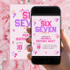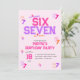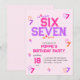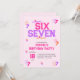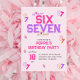 Celebrate a special 6 or 7 birthday with this fun and trendy 6 7 Meme invitation! The design features a vibrant pink and purple varsity style text that reads 'SIX SEVEN' in bold lettering, perfectly capturing the Y2K aesthetic. Scattered around are playful graphics of the numbers 6 and 7, along with retro stars. This invitation is ideal for a unique birthday party theme that embraces the internet meme culture and girly vibes. This invitation is perfect for a birthday bash that's as unique and spirited as the guest of honor.