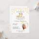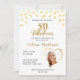 Haz invitaciones únicas a personalizados blancos, negros y dorados por 50 años personalizadas con el nombre de la dama de cumpleaños, foto, día de la celebración y lugar del evento. También puedes cambiar el hito si celebras el 30, el 40, el 60, etc. Los corazones dorados y la tipografía de este producto son elementos del diseño que están en color amarillo dorado para imitar el oro (no un Relieve metalizado, sólo una imitación del oro). Use la plantilla para cargar su imagen para obtener la misma imagen en forma de corazón. Pruebe unas cuantas fotos para elegir cuál se adapte mejor a este diseño. Normalmente, la foto cuadrada funciona mejor.