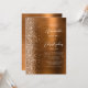 The left-hand edge of this elegant modern wedding invitation features a copper faux glitter border. The customizable text combines white handwriting, copperplate and italic fonts on a copper faux brushed metal background. The reverse side provides space for wedding details on a copper brushed metal background, along with a QR code guests can scan to visit your website and RSVP, which saves the cost of printing and mailing separate RSVP cards.