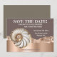 Make a bold and unforgettable first impression with this glamorous coastal save the date design. Featuring a faux gold-edged conch shell with pearly ivory shimmer and pearlised off-white detailing, the composition is set against a luxurious dusky pink jagged backdrop with a soft faux glitter edge that adds a subtle sparkling effect.