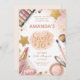Celebrate in style with this elegant blush pink and gold design featuring makeup brushes, lipstick, glittering stars, and a soft watercolor background. Perfect for a glamorous Sweet 16 celebration full of sparkle and joy.