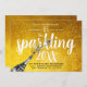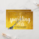 Esta elegante invitación a la fiesta de Año Nuevo tiene una botella vintage de champán espumoso sobre un fondo de oro falso con confetti purpurinoso de oro falso y un gran guión blanco moderno. La parte posterior tiene el mismo fondo con una textura dorada. El texto es personalizable, puedes personalizarlo y convertir esta carta en una elegante invitación de cumpleaños para hombres y mujeres! Está disponible tanto en formato de impresión como de descarga digital.