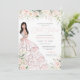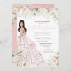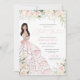 Elegante diseño lujoso con rosas blandas y rosas blancas, acentos dorados rosas y una hermosa muñeca con un lujoso y florido vestido de bolas. Todo el texto es completamente personalizable.