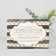 ¡Aquí están las invitaciones modernas a la ducha de novias con glamour! Los invitaciones tienen un marco ornamental blanco y detalles de texto de color dorado sobre rayas horizontales negras estilo acuarela sobre puntos de polka purpurina de oro falso. Puede personalizar o cambiar la información a su gusto. El diseño se ve mejor con la opción de papel estilo esquinas redondeadas.
