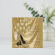 La glamorosa invitación para la fiesta de cumpleaños de la mujer con hermosos zapatos de tacón de purpurina dorado, globos dorados, perlas de champán y elegantes remolinos de oro sobre un lujoso fondo de satén dorado. Esta elegante invitación para una fiesta de cumpleaños de oro se personaliza fácilmente para tu evento, simplemente añadiendo tus detalles en el estilo de letra y color, la redacción y el diseño de tu elección. También puedes mover o borrar los remolinos, el champán y los globos. Se trata de un diseño impreso sin joyas, perlas, purpurinas, etc.