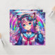 Invitaciones personalizadas para fiestas de cumpleaños de chicas. Anime glitchcore chica con audífonos y orejas zorro arte de ai púrpura, rosa, azul y verde colorido.