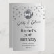 Estas invitaciones para el cumpleaños del personalizable incluyen una bola de disco y un fondo sombrío plateado para una fiesta temática de "glitz y glam".